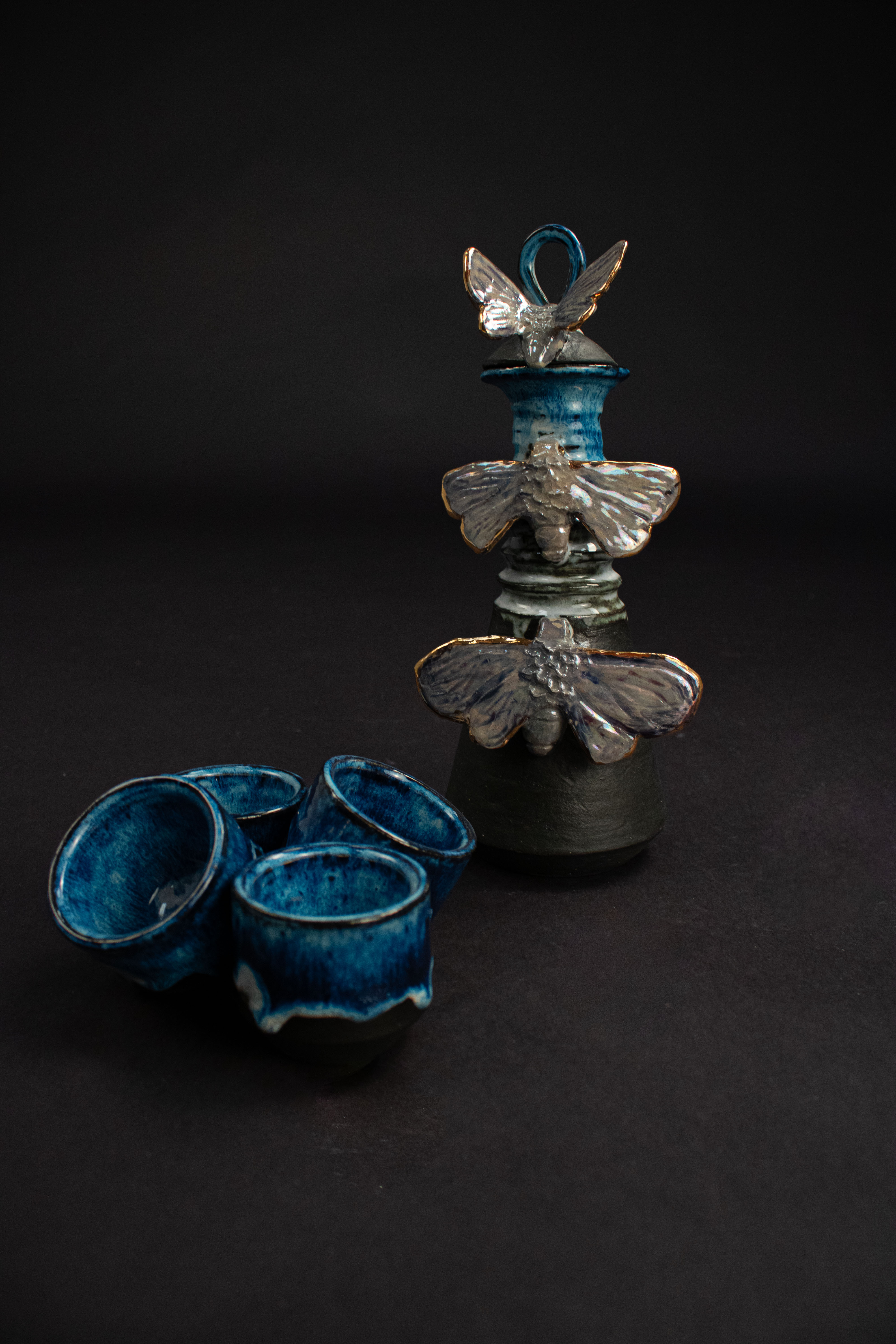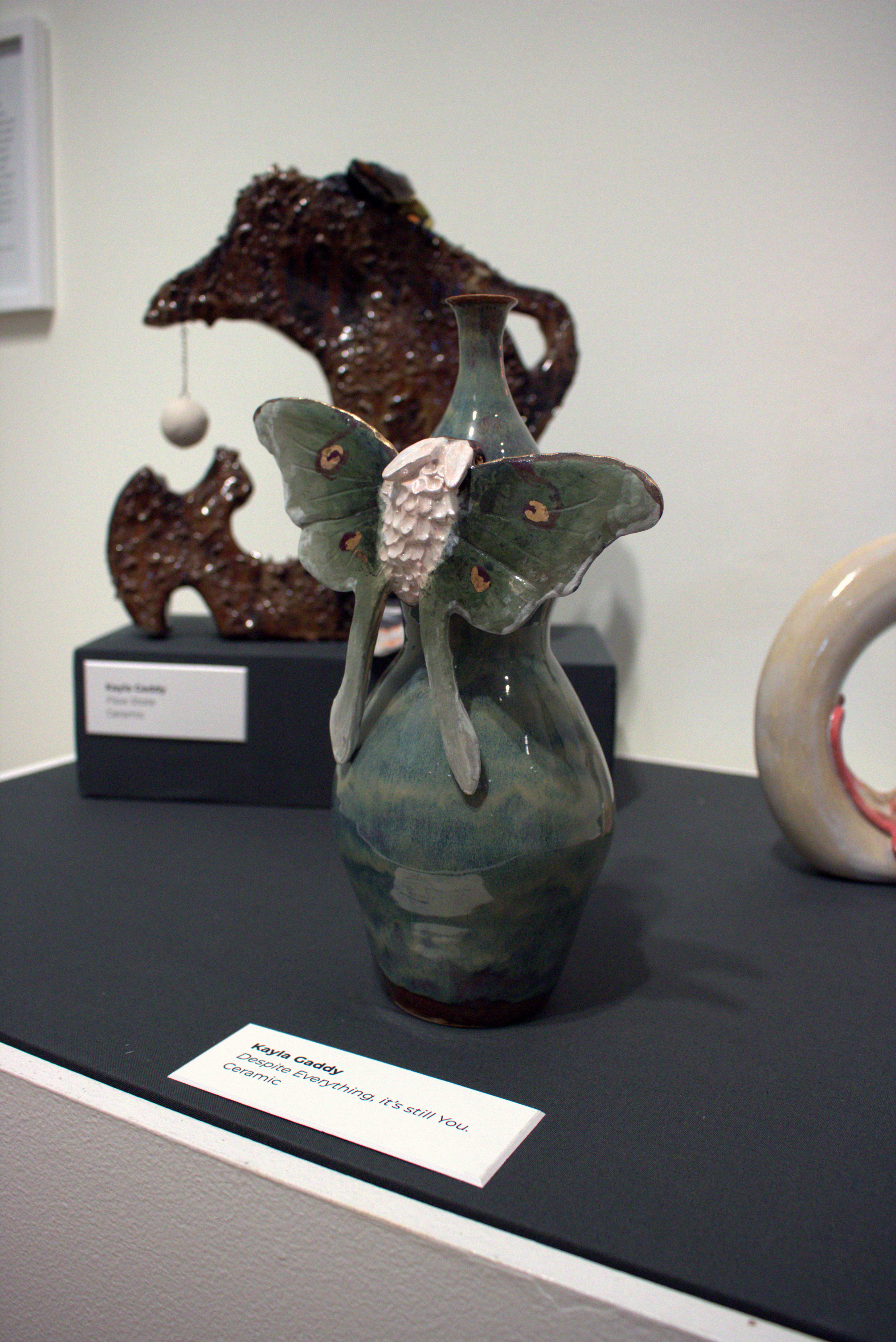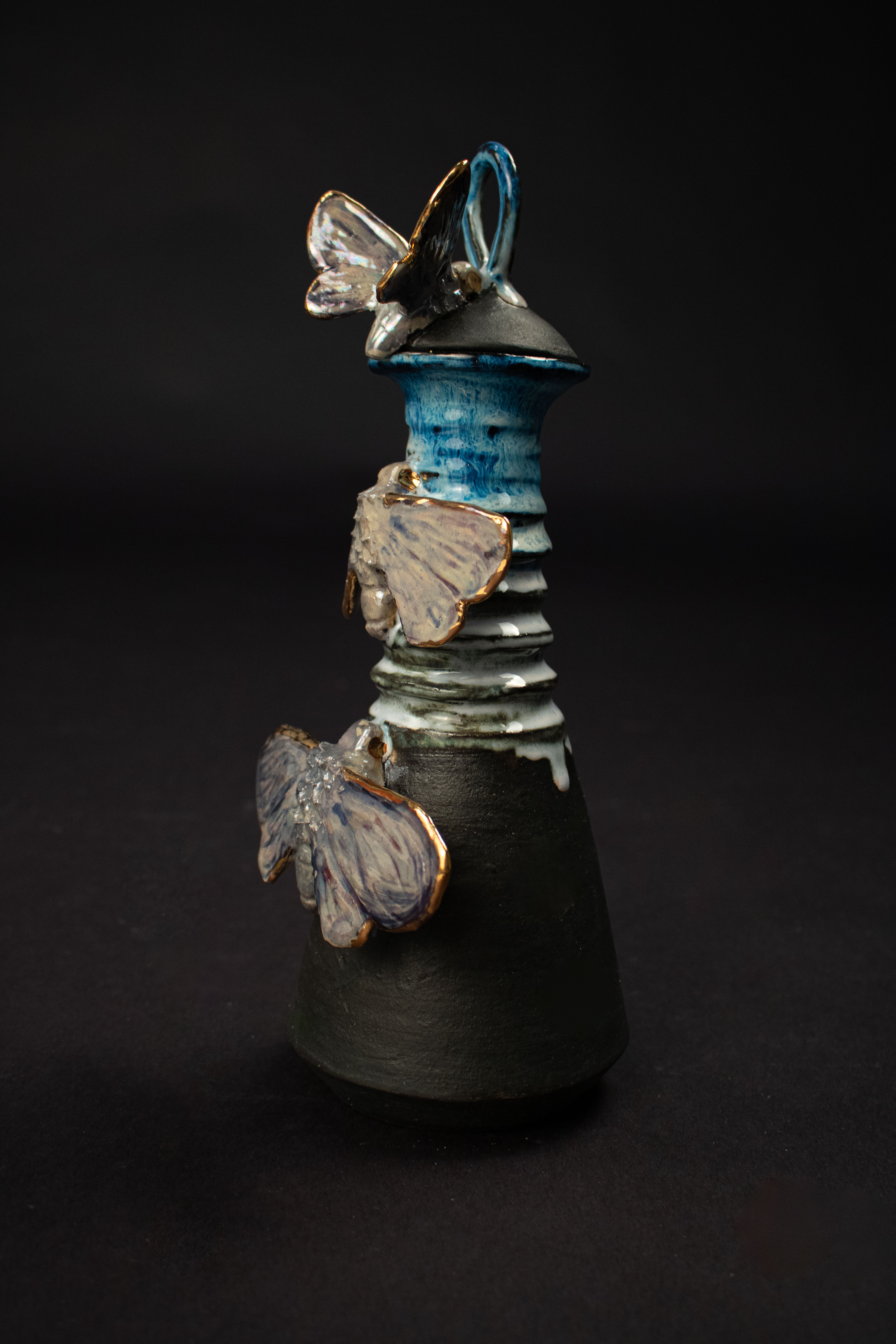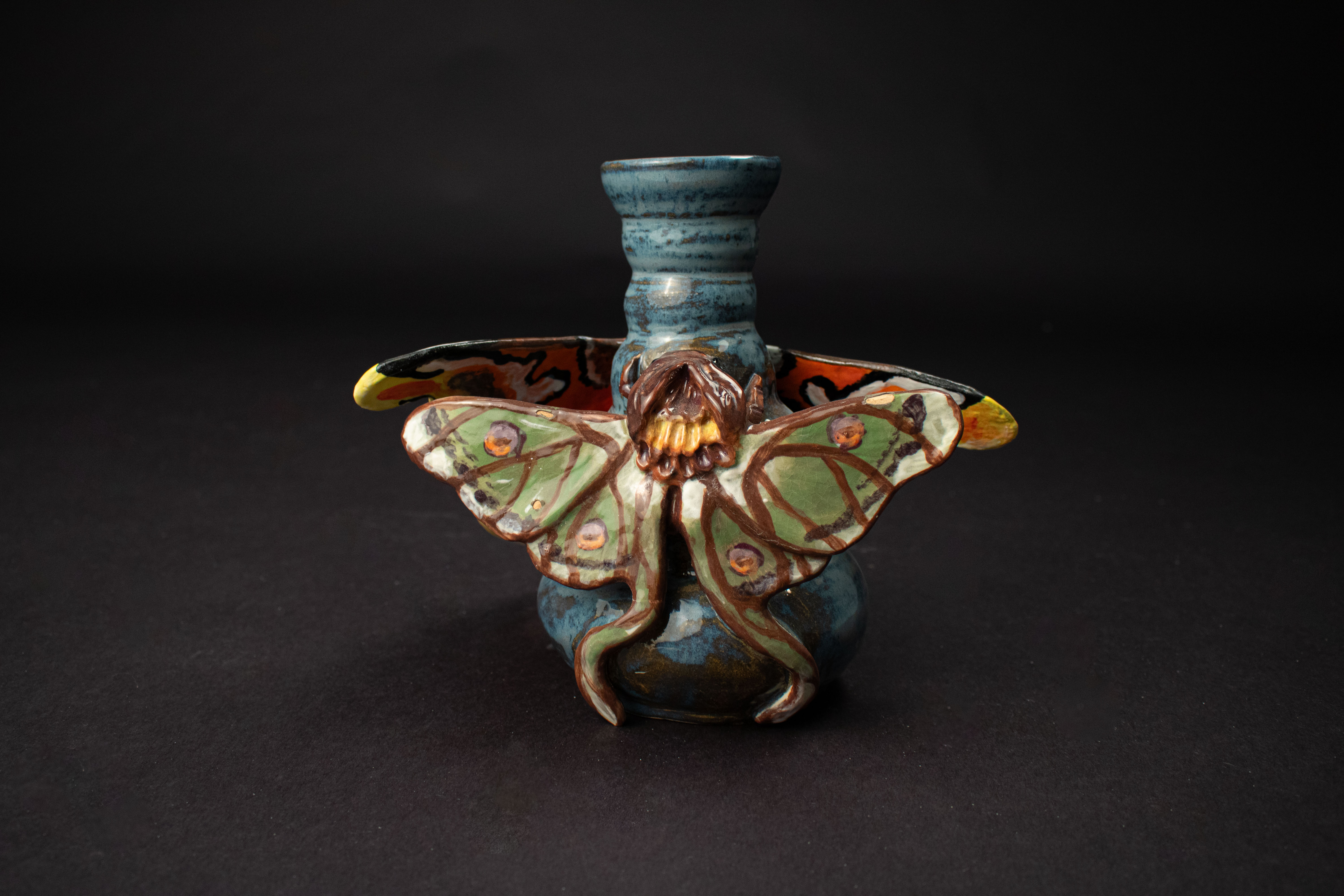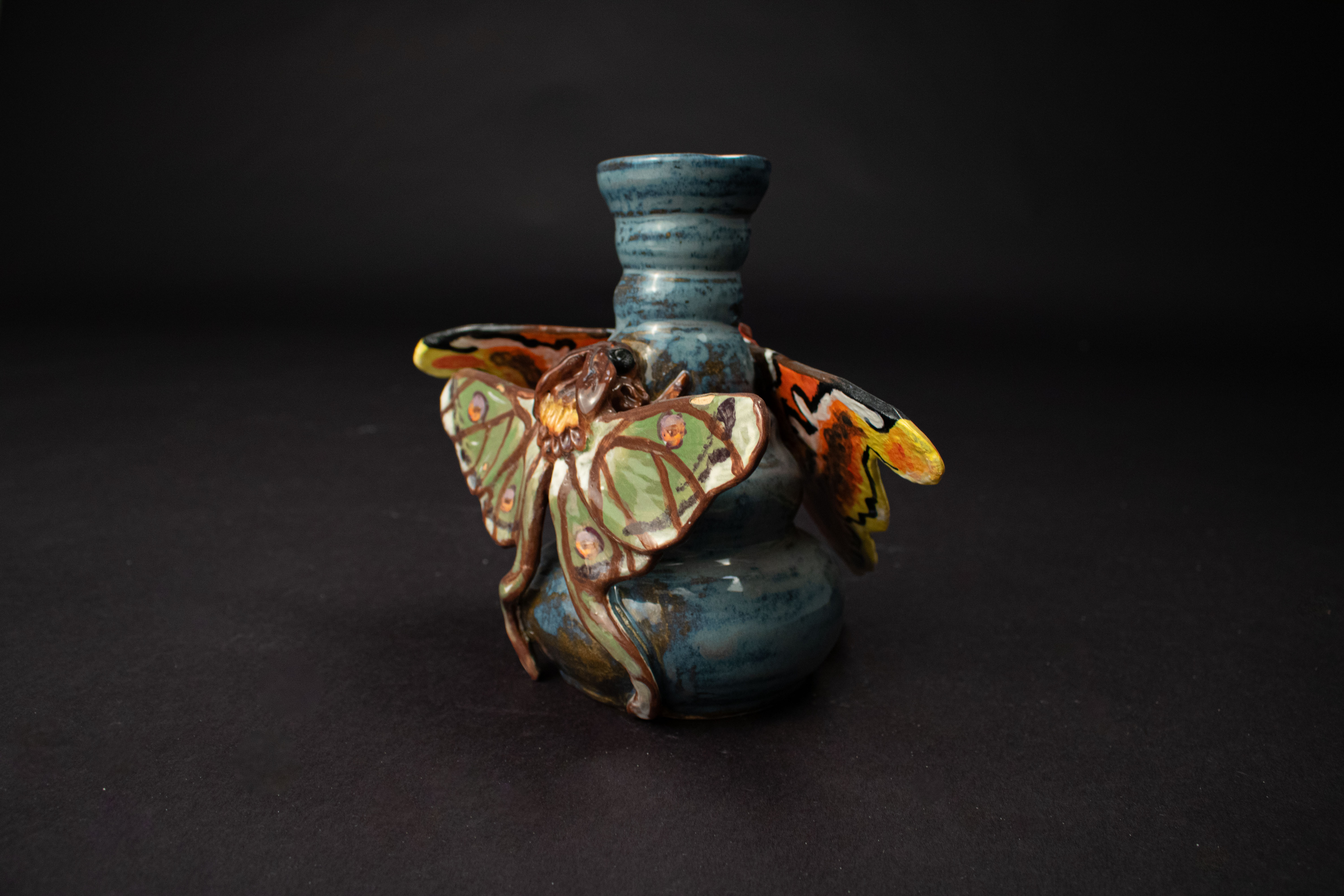 This entirely ceramic series reflects my personal journey through life. Relationships, like the intricate patterns on a moths wings, are both delicate and essential to self-discovery. Each moth in the series carries symbolic meaning, from self-love to life’s cyclical nature. This series fuses historic ceramic vessels and a material exploration with a sprinkle of moth symbolism. I draw from the pagan belief that moths inherently represent transformation through suffering, as well as serve as messages from ancestors, guiding us towards our life’s path. These moths have a range of underlining meanings as well, such as the Rosy Maple Moth found on Motherly Light, which represents the universal love of oneself and others. The entire piece depicts my mother’s unwavering guidance. Where as the Tiger Harness Moths found on This Too Shall Pass portray the spark of inspiration, the entire piece reflects my relationship with creativity – both expressive and meditative. The centerpiece, Despite everything, it’s still you., is a self portrait afriming that,
