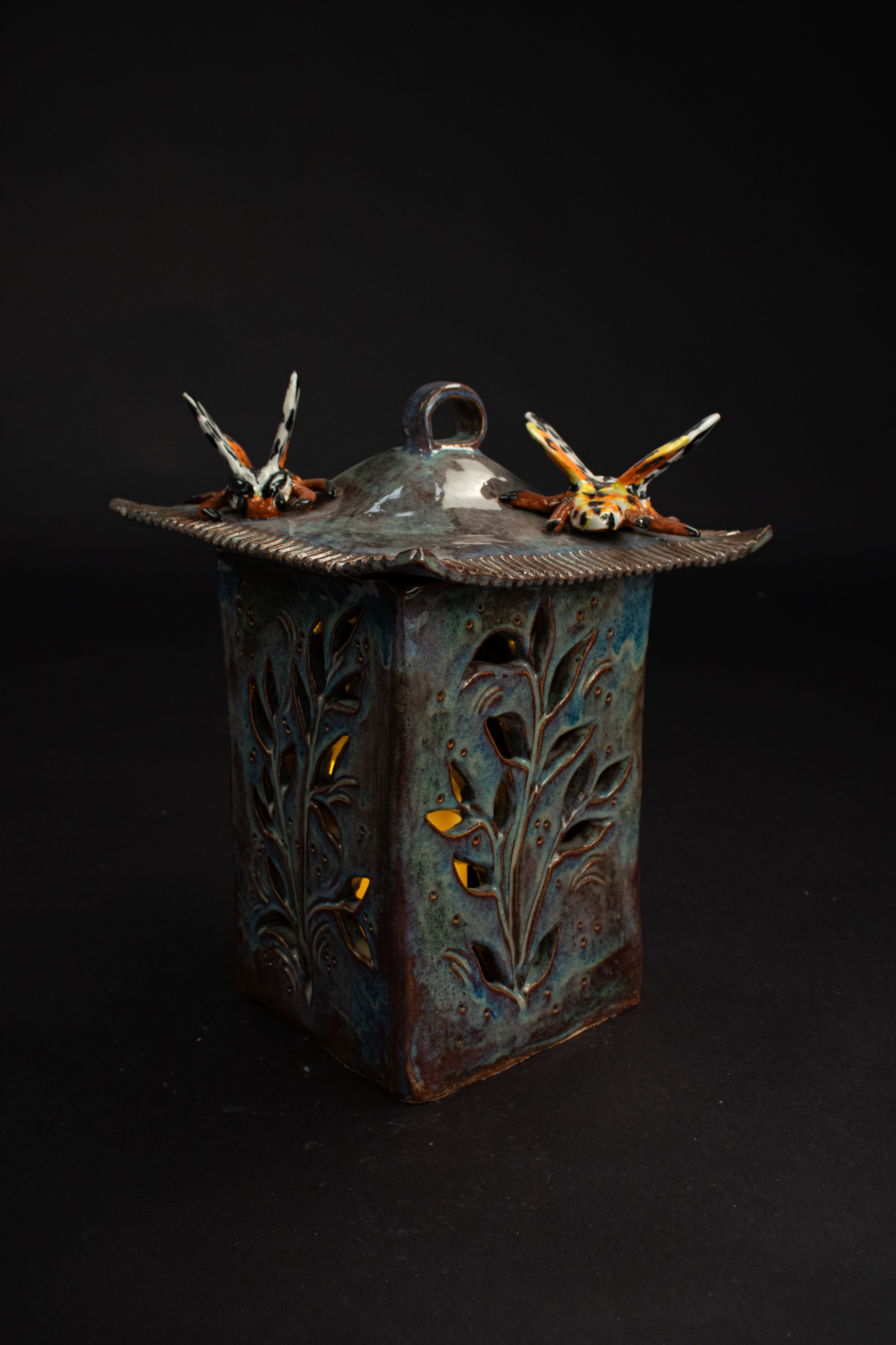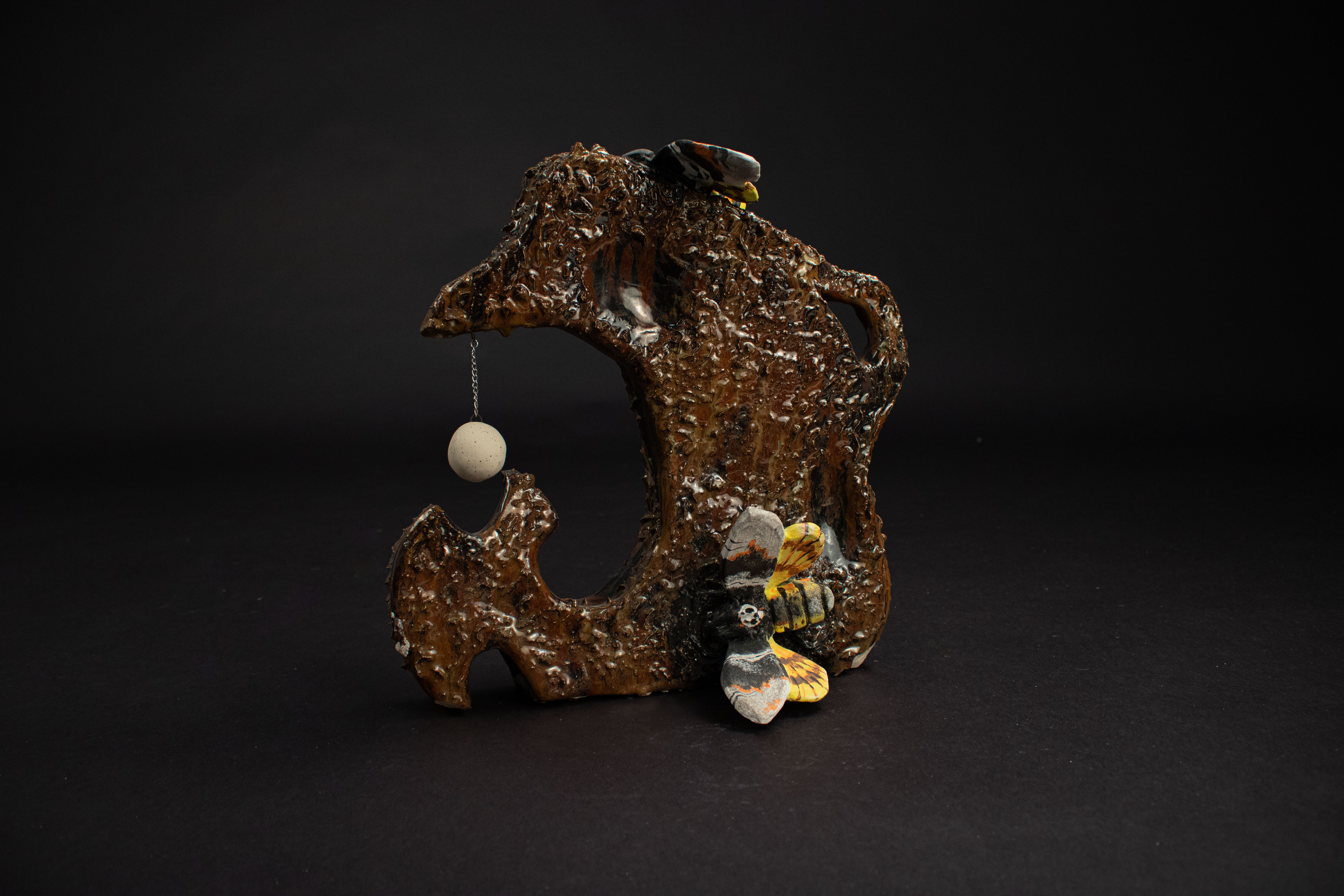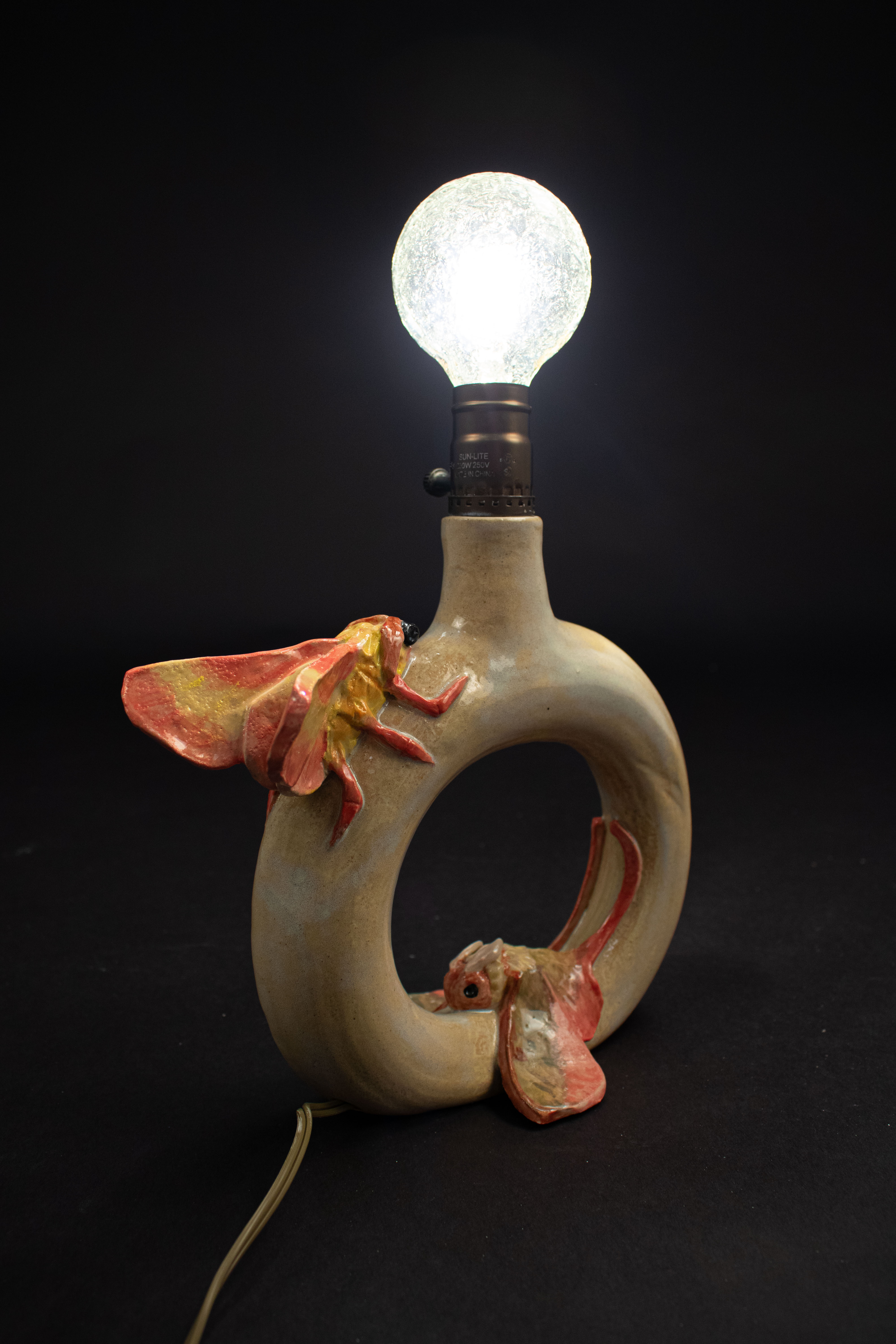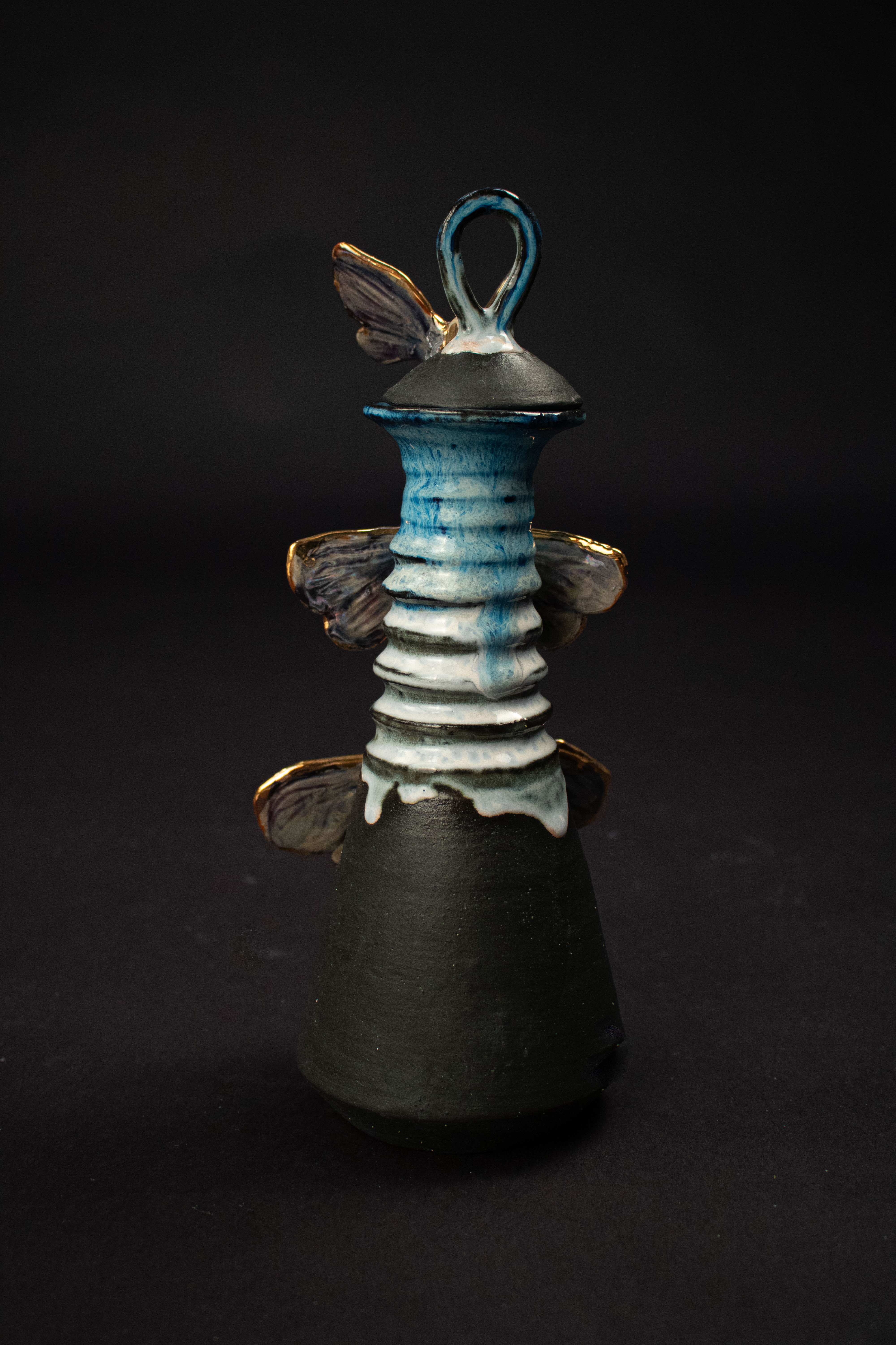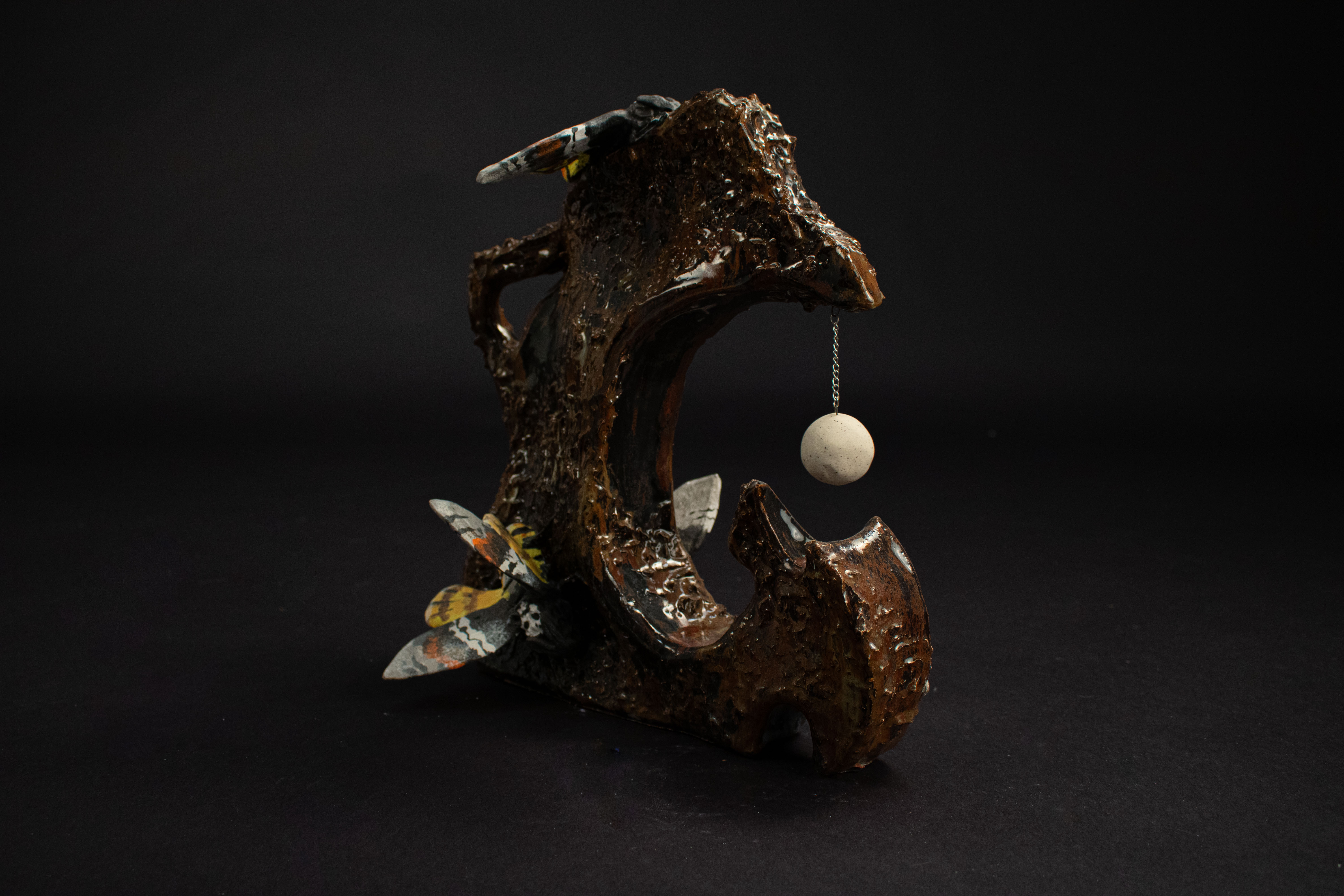 This entirely ceramic series reflects my personal journey through life. Relationships, like the intricate patterns on a moths wings, are both delicate and essential to self-discovery. Each moth in the series carries symbolic meaning, from self-love to life’s cyclical nature. This series fuses historic ceramic vessels and a material exploration with a sprinkle of moth symbolism. I draw from the pagan belief that moths inherently represent transformation through suffering, as well as serve as messages from ancestors, guiding us towards our life’s path. These moths have a range of underlining meanings as well, such as the Rosy Maple Moth found on Motherly Light, which represents the universal love of oneself and others. The entire piece depicts my mother’s unwavering guidance. Where as the Tiger Harness Moths found on This Too Shall Pass portray the spark of inspiration, the entire piece reflects my relationship with creativity – both expressive and meditative. The centerpiece, Despite everything, it’s still you., is a self portrait afriming that,