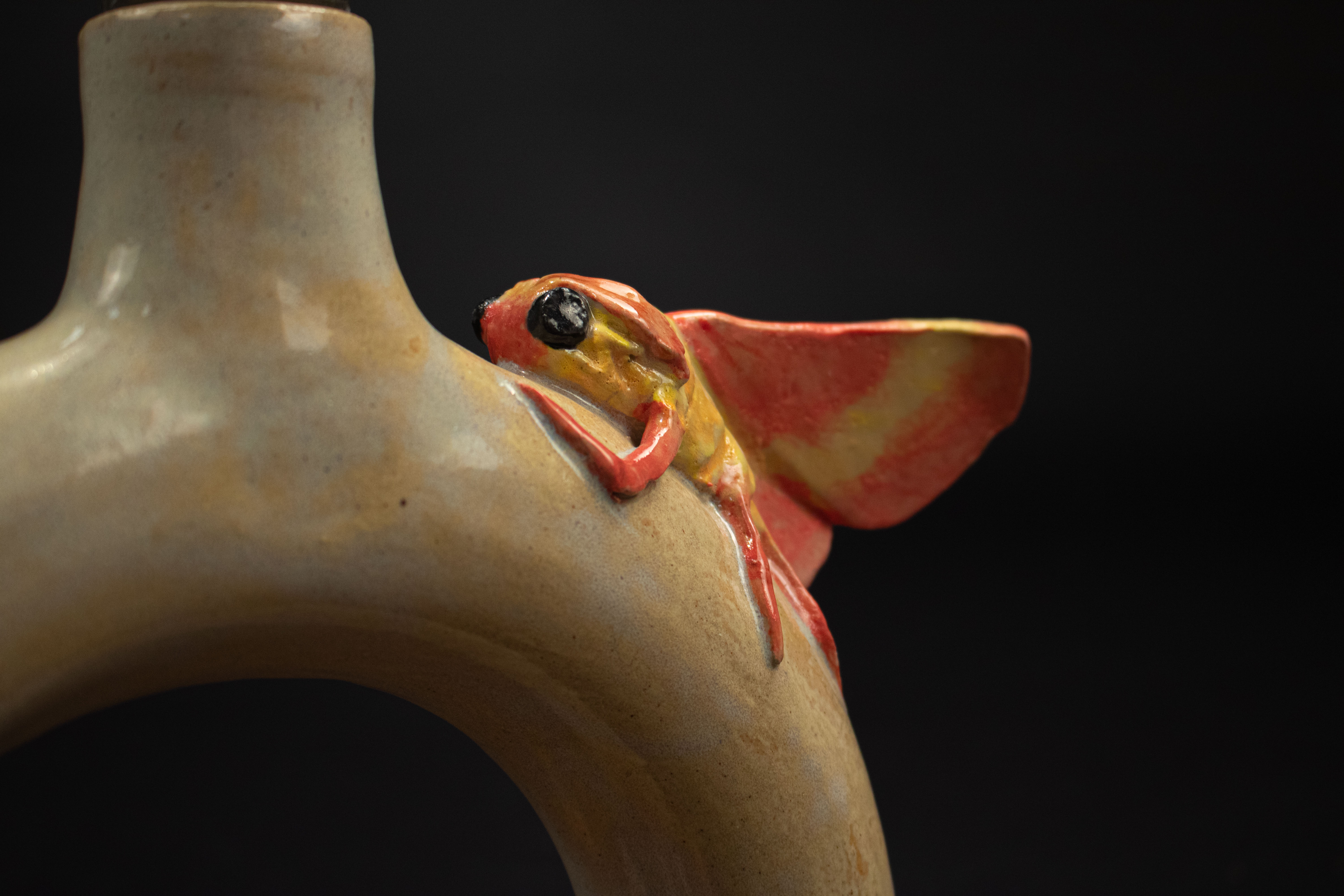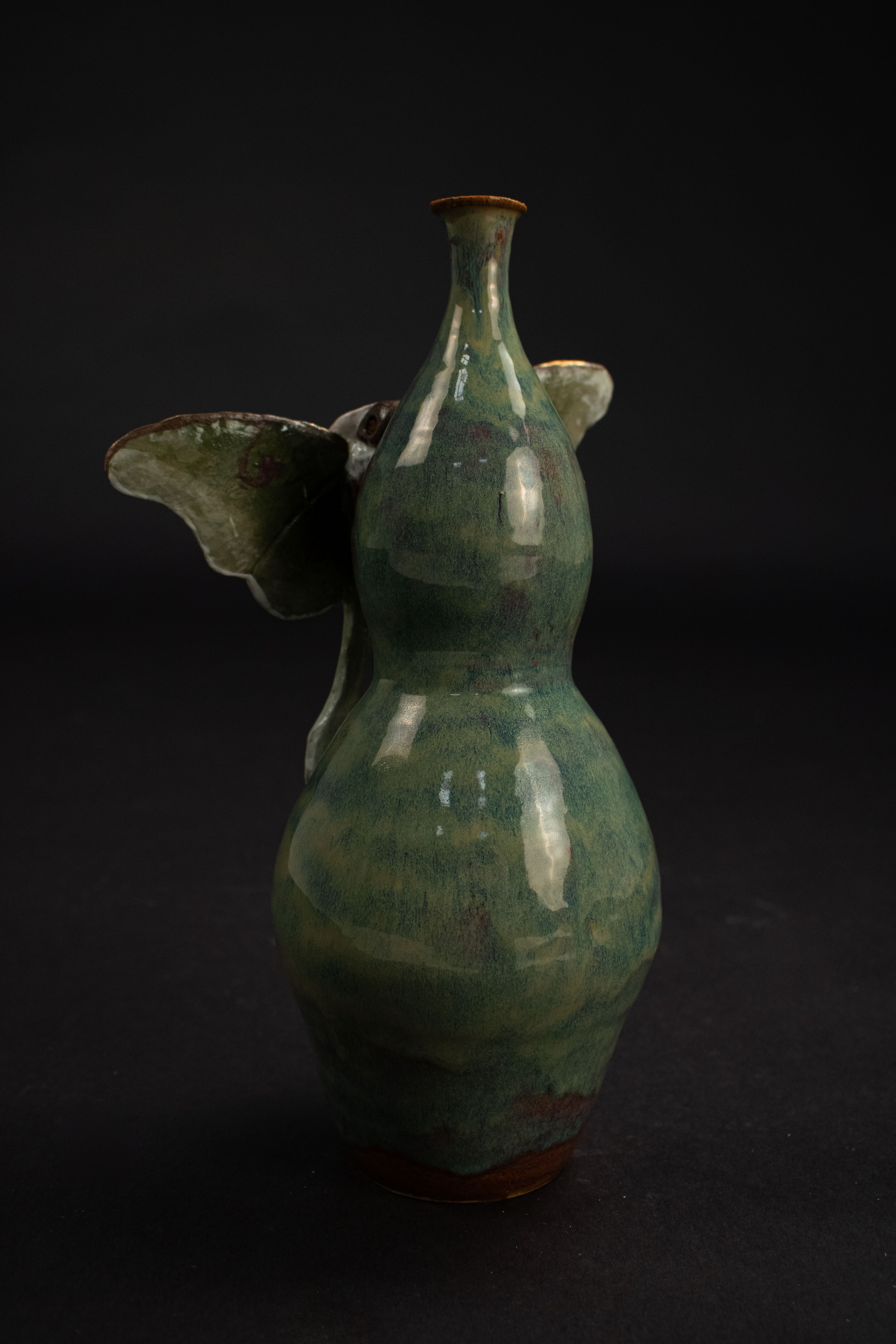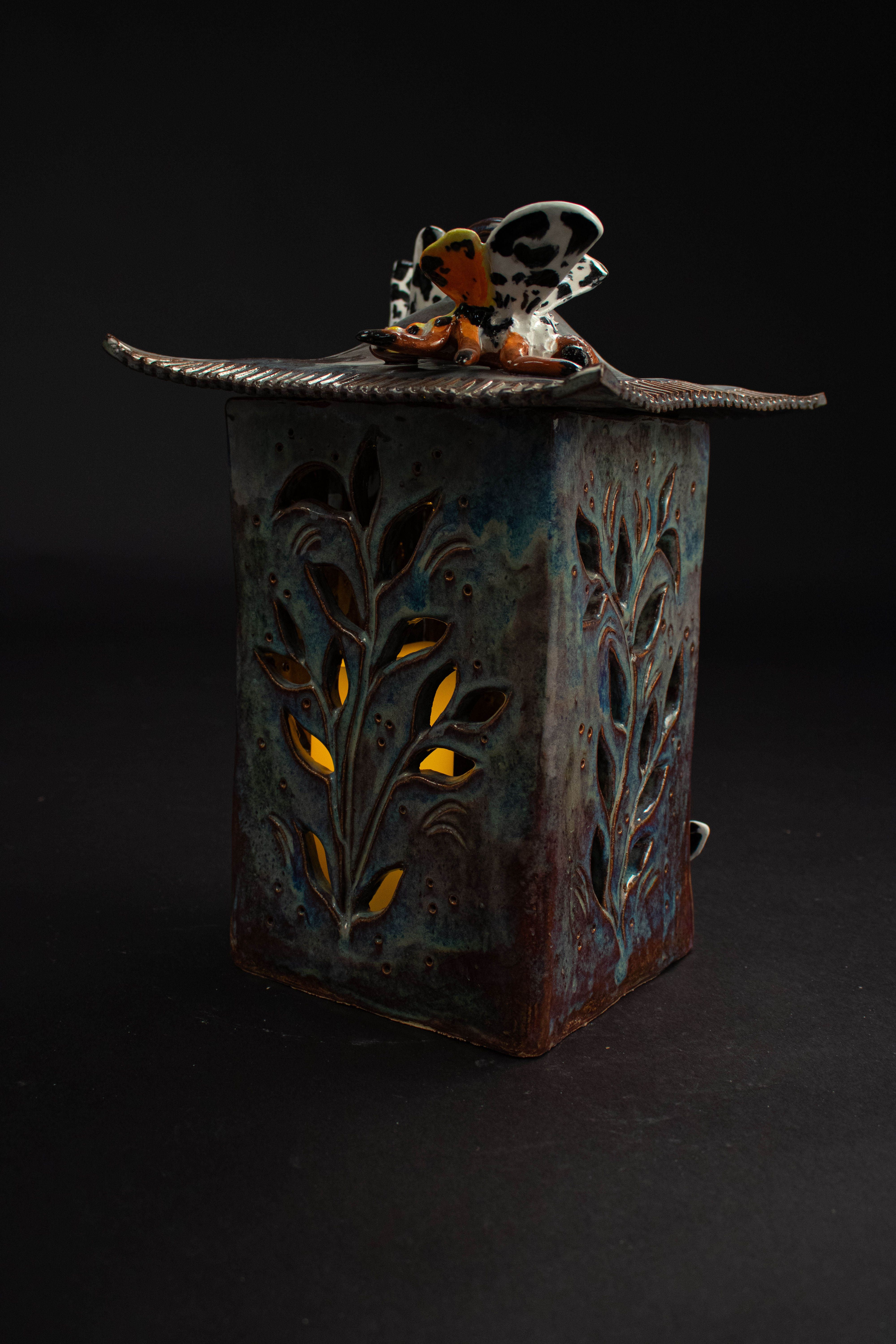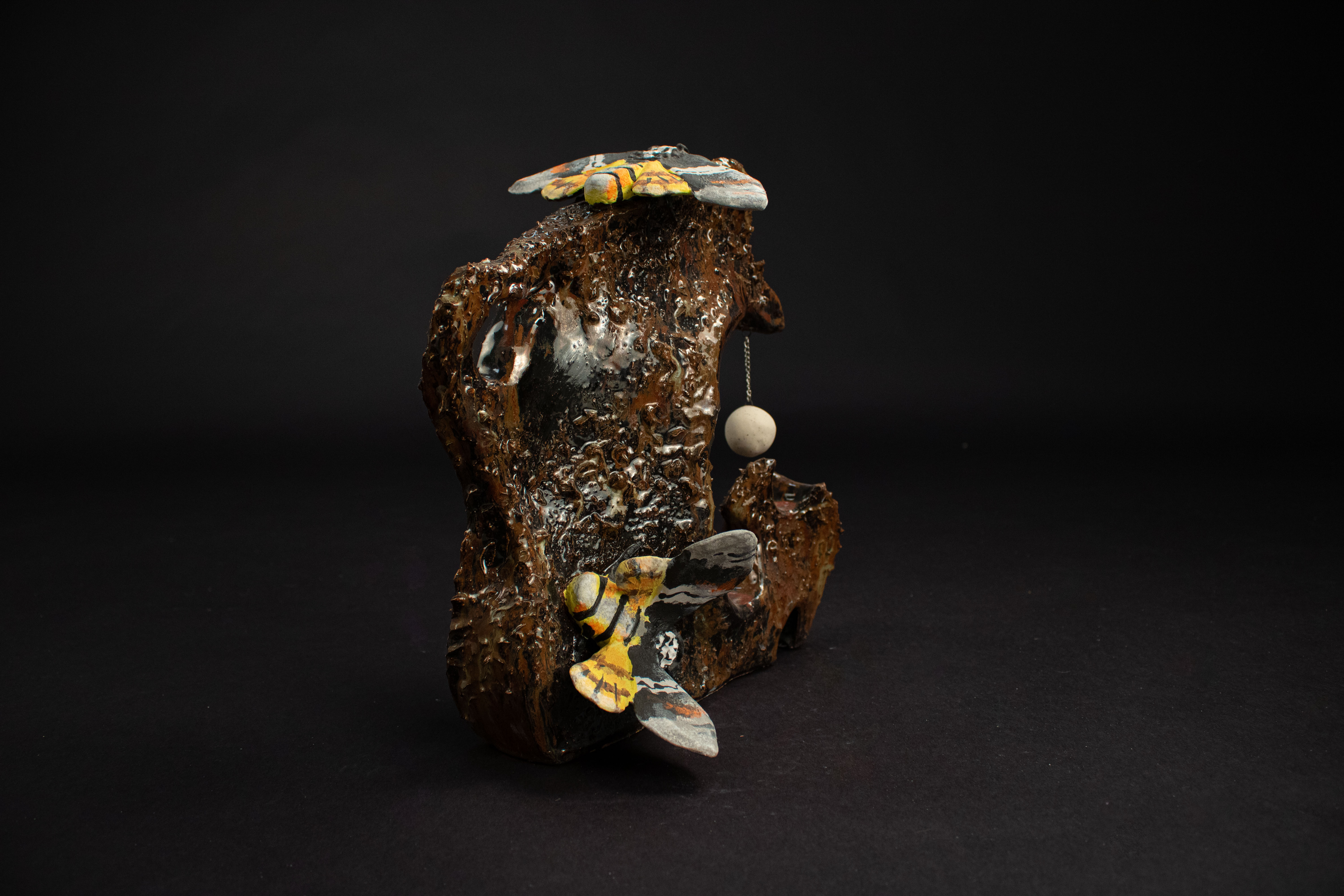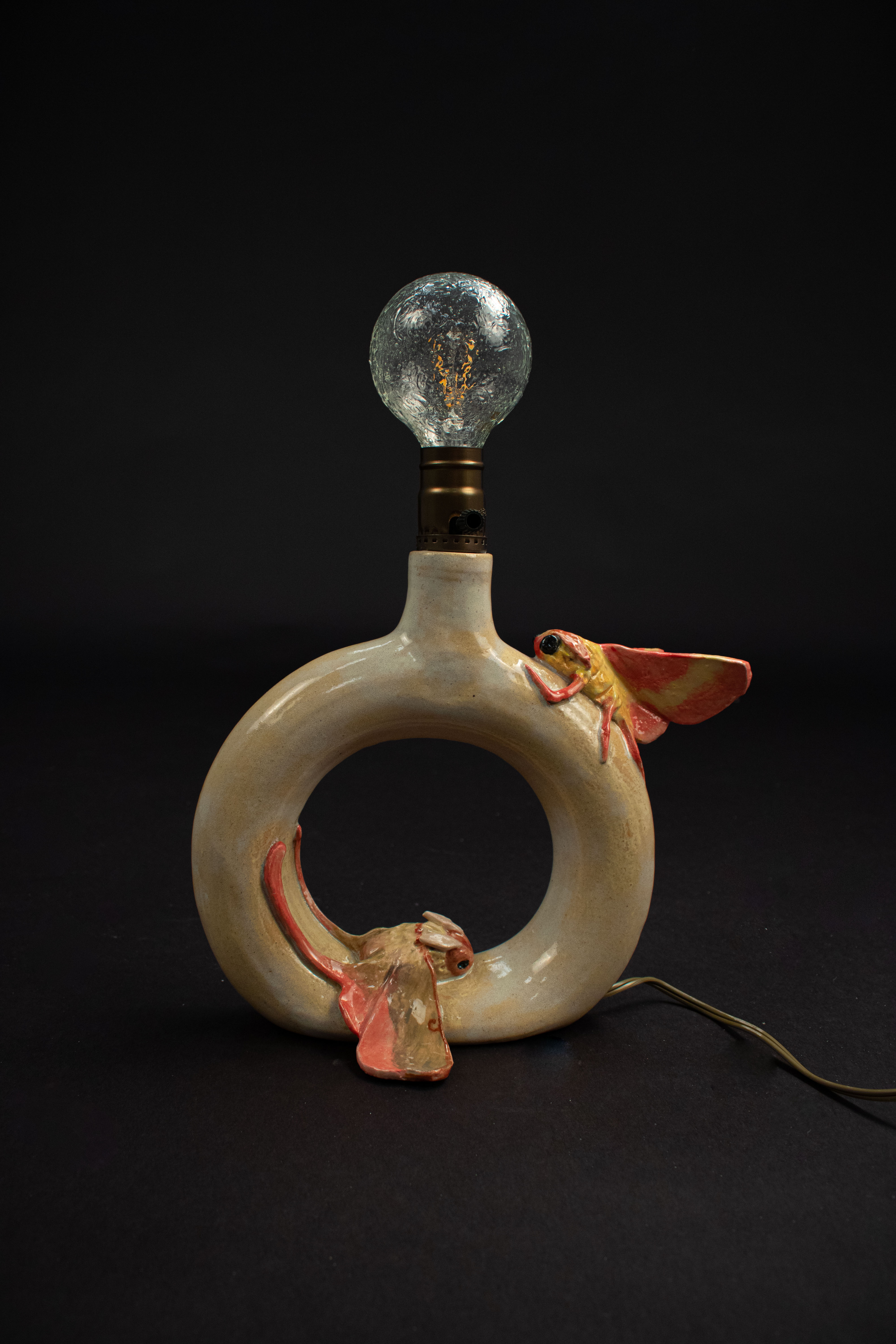 This entirely ceramic series reflects my personal journey through life. Relationships, like the intricate patterns on a moths wings, are both delicate and essential to self-discovery. Each moth in the series carries symbolic meaning, from self-love to life’s cyclical nature. This series fuses historic ceramic vessels and a material exploration with a sprinkle of moth symbolism. I draw from the pagan belief that moths inherently represent transformation through suffering, as well as serve as messages from ancestors, guiding us towards our life’s path. These moths have a range of underlining meanings as well, such as the Rosy Maple Moth found on Motherly Light, which represents the universal love of oneself and others. The entire piece depicts my mother’s unwavering guidance. Where as the Tiger Harness Moths found on This Too Shall Pass portray the spark of inspiration, the entire piece reflects my relationship with creativity – both expressive and meditative. The centerpiece, Despite everything, it’s still you., is a self portrait afriming that,